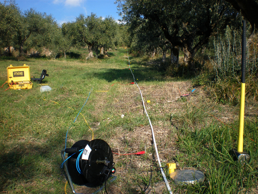 Per avere un confronto quanto più diretto possibile, si riporta come esempio uno stendimento sismico parallelo ad un profilo geoelettrico, di uguale lunghezza e direzione, posti a circa 30 cm l’uno dall’altro. Per la tomografia elettrica sono stati installati 32 elettrodi intervallati di 4 metri con Array Dipolo-Dipolo, mentre per la sismica a rifrazione sono stati usati 24 geofoni verticali con un passo di 4 metri e con 9 shots equidistanti tra loro e speculari rispetto al centro della base sismica. Le energizzazioni avvengono tramite l’impatto tra una mazza da kg 8 ed una piastra in lega di alluminio posta sul terreno.